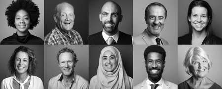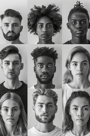 Collage made of portrait of multiethnic people, men and women of different race. Monochrome image. Universal principle of equality