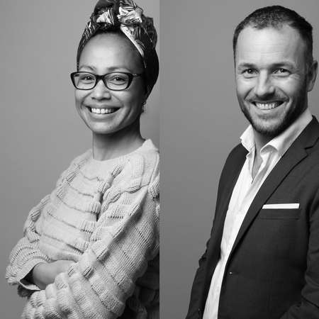 Side-by-side portraits of a Black person and a White person, emphasizing contrast and racial differences.