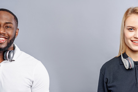 close up view of young interracial couple looking at camera isolated on gray
