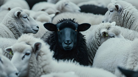 A lone black sheep surrounded by a sea of white sheep, creating a striking contrast that symbolizes nonconformity and being different.