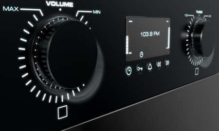A 3D render closeup of the front face of a modern black radio with illuminated dials and a digital screen