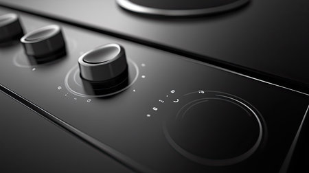 Close-up view of a modern electric stove control panel featuring sleek knobs and a touch display. Ideal for contemporary kitchens and culinary enthusiasts.