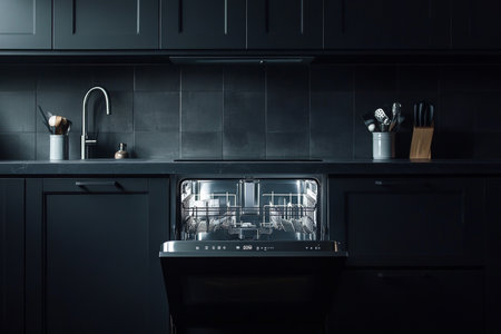 Modern kitchen featuring an open empty dishwasher in dark color palette for stylish interiors