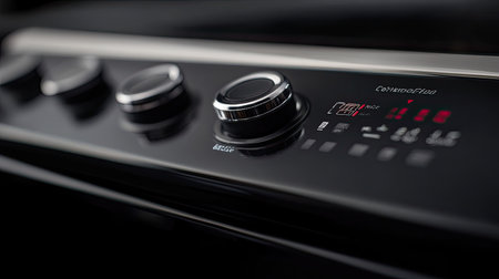A captivating close-up of a modern kitchen oven's control panel featuring sleek knobs and a digital display, highlighting contemporary design in a stylish home environment.