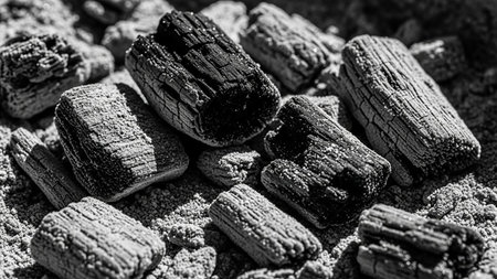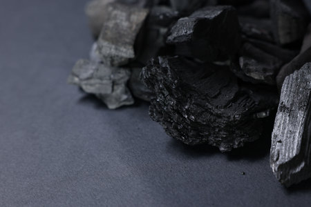 Natural hardwood charcoal on black textured background