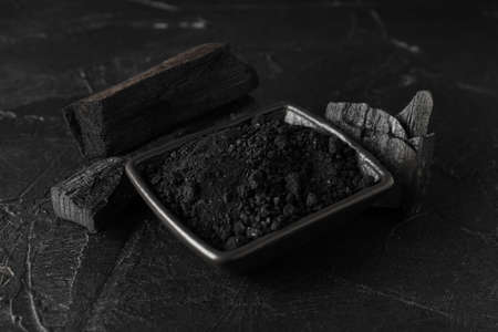 Group of charcoal black color made from real wood in studio close-up shot which use for cooking or absorb odor in room or refrigerator. And use in some cosmetic industry.
