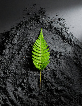 A single, vibrant green fern leaf emerges from a mound of dark soil, symbolizing hope, resilience, and the powerful concept of new life and growth against all odds.