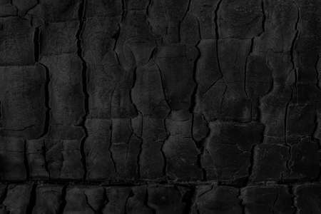 Background, black charred timber, coal after fire, abstract and in cracks of charcoal.