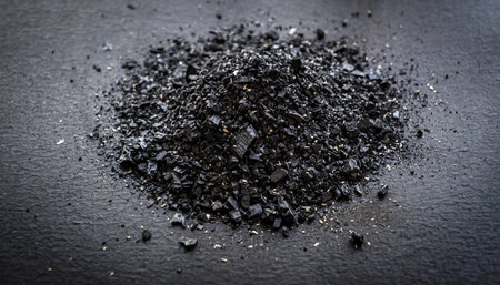 Close-up of coal pieces glistening under industrial lighting, with clear space for text.