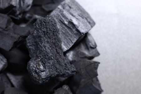 Pieces of black coals on gray table, closeup. Space for text