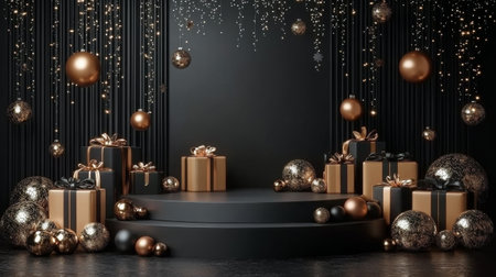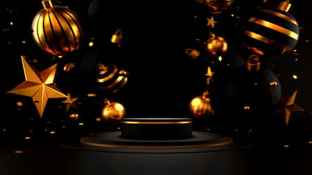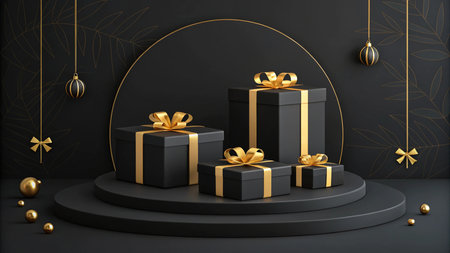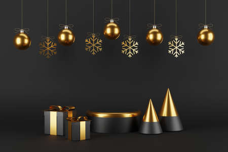 Black podium with gold gift boxes and Christmas decorations. 3D rendering