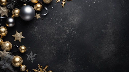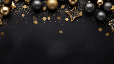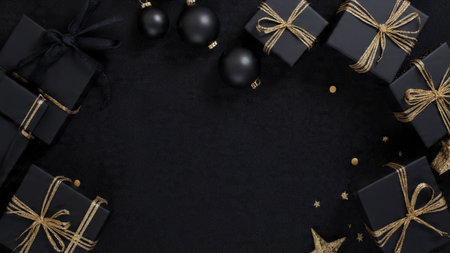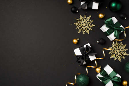 Christmas or New Year background with black gift boxes, golden balls, stars and decorations. Top view with copy space.