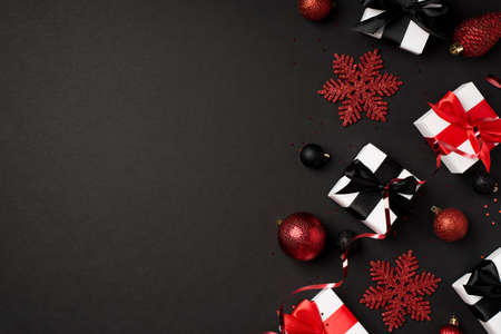 Top view photo of christmas decorations red and black balls toy cone snowflakes small white gift boxes with red and black ribbon bows serpentine sequins on isolated black background with empty space