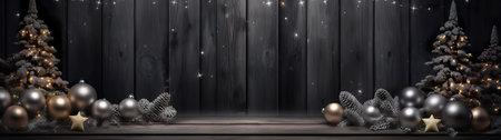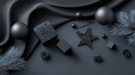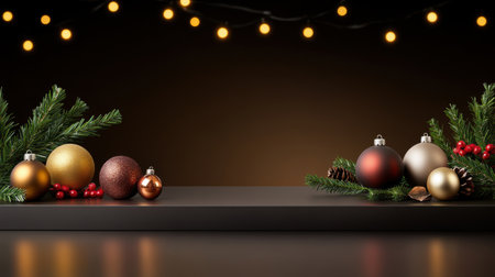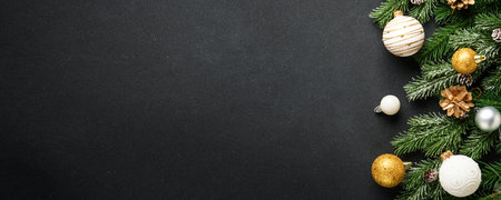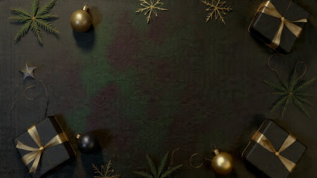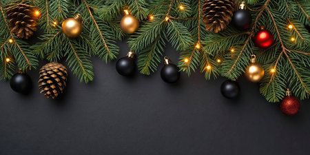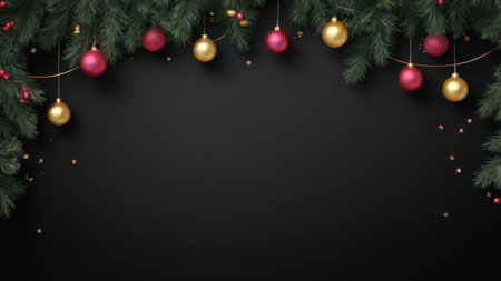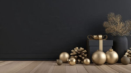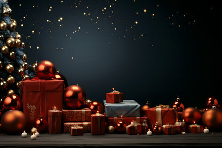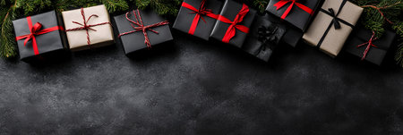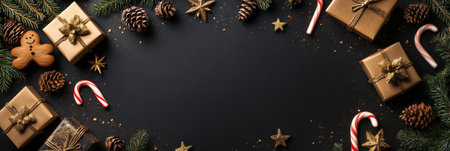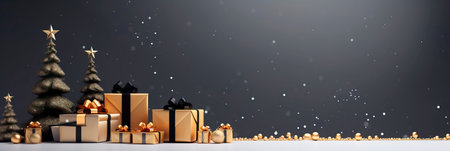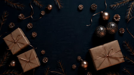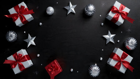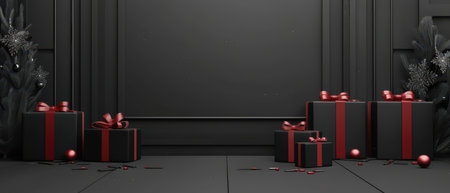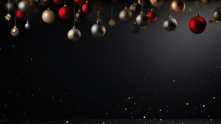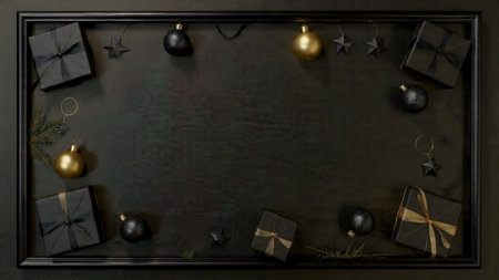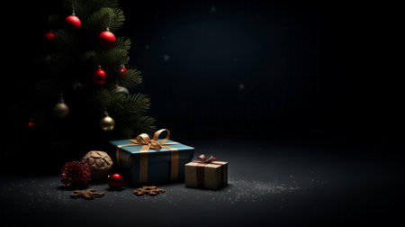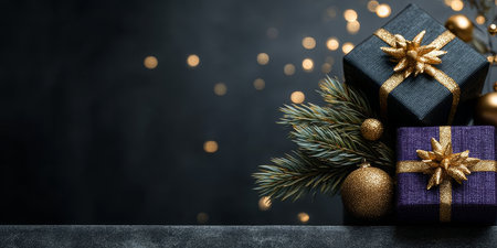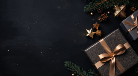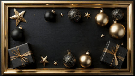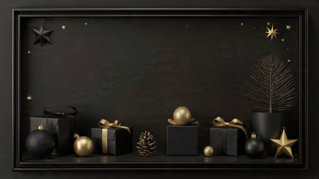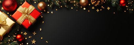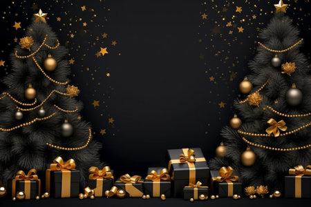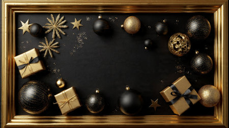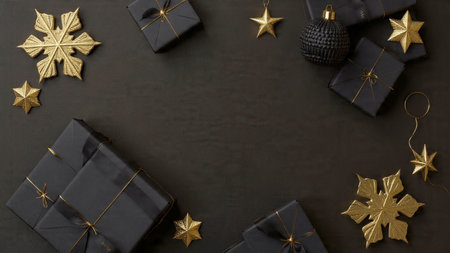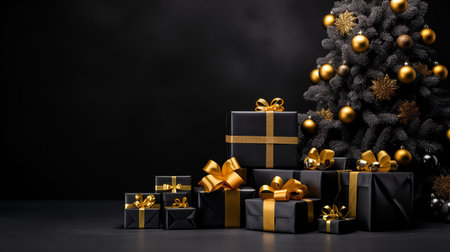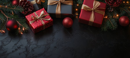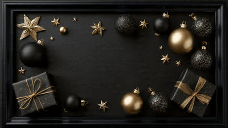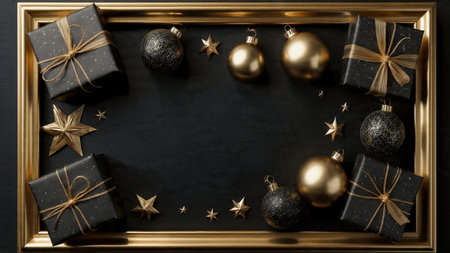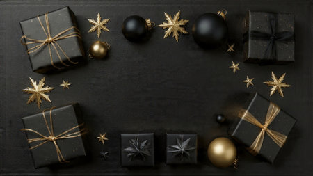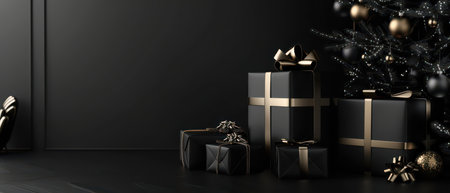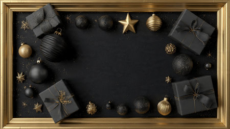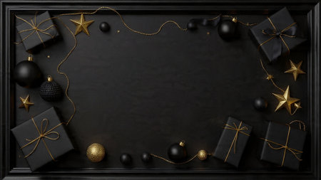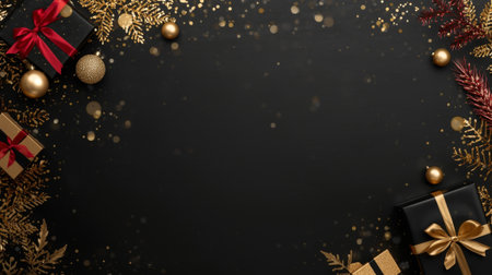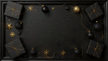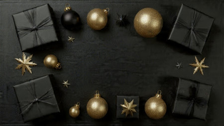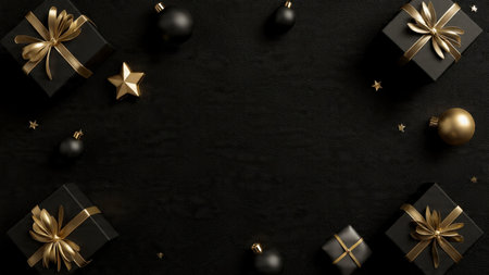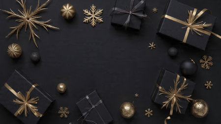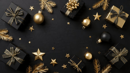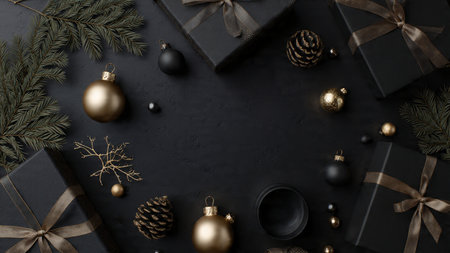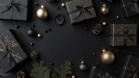 Festive Christmas decorations and wrapped presents on a sleek black background, perfect for holiday greetings.