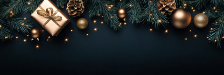 Christmas Presents Surrounded by Pine Tree Branches and Golden Ornaments on Dark Background.