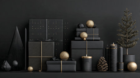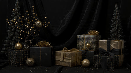 A velvety black background paired with radiant gold ornaments and upscale gift boxes creates a sophisticated holiday display.