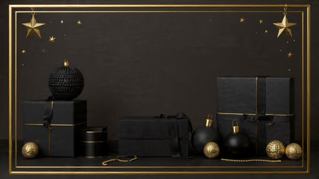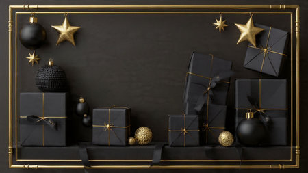 A stylish matte-black frame decorated with gold stars and high-end wrapped gifts.