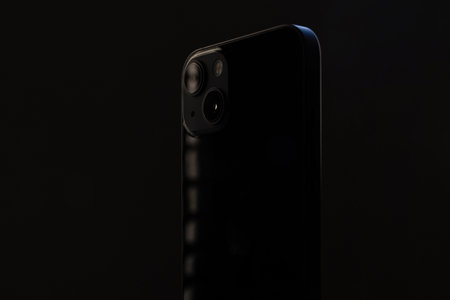 stylish glossy rectangular smartphone with two cameras on a black isolated background close-up.