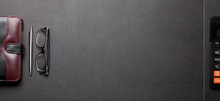 Black leather office table with calculator, notebook and green plant. Top view with copy space