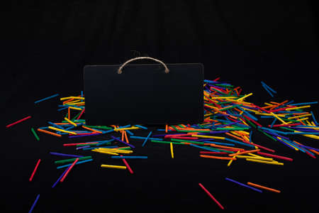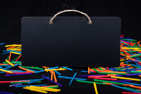 Rectangular shaped black notice board on colorful sticks on black