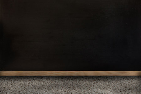 Flat design is showing dark green chalkboard mounting on wall with wooden tray above carpeted floor. Educational, office, minimalist, interior, learning, workspace, neutral
