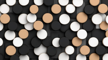 A close-up view of a textured surface composed of circular shapes in black, white, and beige, creating a visually engaging pattern.