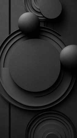 An abstract composition features dark geometric circles of varying sizes and positions against a black backdrop. The monochromatic color palette emphasizes the shapes and shadows, creating depth and a modern aesthetic. Suitable for various design applications, it may be used for marketing, advertising, or editorial content.