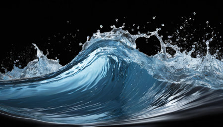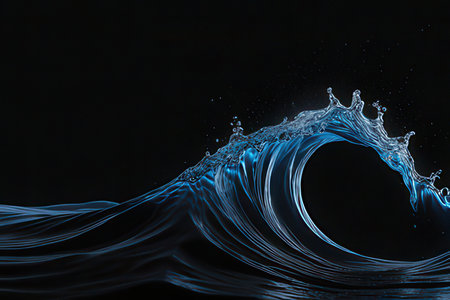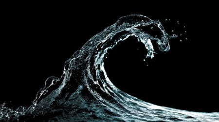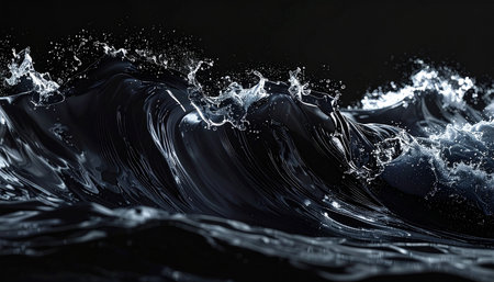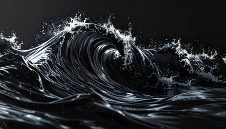 A dark, glossy wave crests with dynamic water splashes and droplets against a black background.