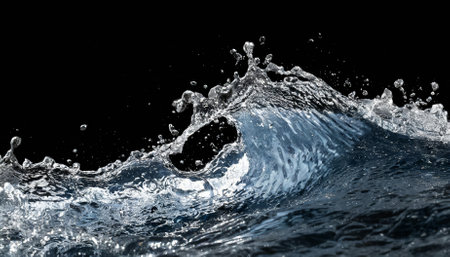 A dark ocean wave with white foam splashes and subtle ripples against a black background.