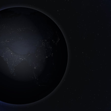 This visual showcases Earth at night, illuminated by city lights across various continents, emphasizing human presence and urban development in the dark.