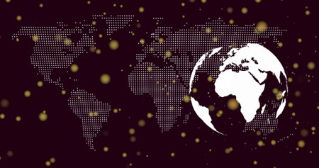 Displaying globe silhouette showing Europe Africa on purple, dotted map, golden circles copy space. Global, technology, futuristic, abstract, digital, innovation, network