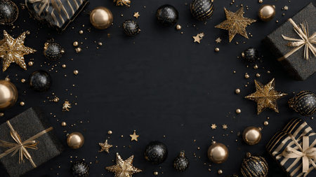 A stylish matte-black frame decorated with gold stars and high-end wrapped gifts.