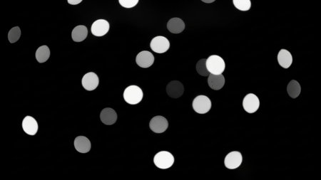a collection of scattered, out-of-focus circular shapes in varying shades of white and gray against a deep black background. The bokeh effect creates a soft, ethereal atmosphere, with individual lights appearing as luminous orbs. The arrangement is random, suggesting a sense of movement or a starry night sky. The monochrome palette emphasizes the abstract nature of the composition, making it a variety of applications requiring a subtle yet impactful visual
