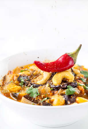 Eggplant curry with cashew nuts, chili and coriander on white background with space for text