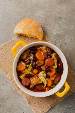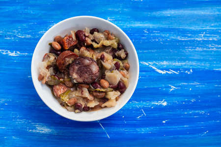 Traditional portuguese goulash with cabbage, beans and ribs. Top view. Stone background.