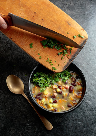 Red bean soup with potatoes, tomatoes, paprika, carrots, and bacon on a black stone table. Sprinkle the chopped parsley into the bowl of soup.