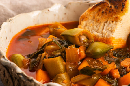 Croatian Potato and Fava Bean Soup with Tomatoes, Celery and Toasted Baguette on Handmade Ceramic Plate