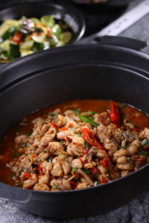 Stew with kidney beans, baked beans, chicken meat and vegetables on a plate with spoon