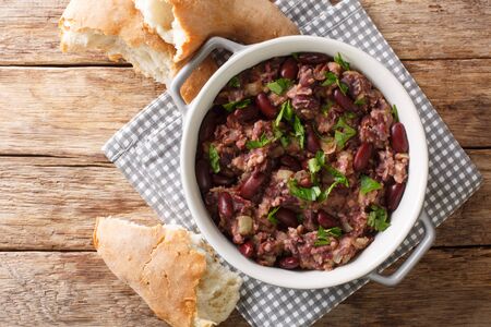 red bean lobio, with fried onions, garlic and cilantro closeup in a pan on the table. Horizontal top view from above