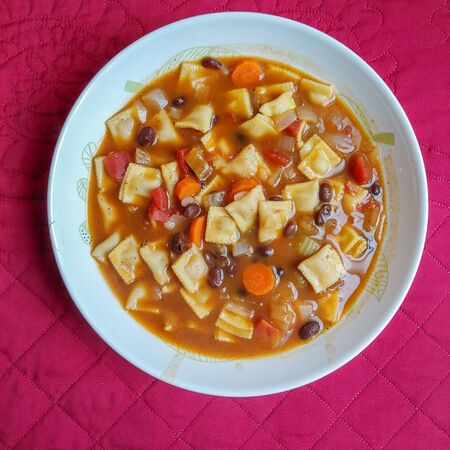 Vegetable dish soup with beans peas potatoes onions tomato and garlic in a white pink plate bowl with fork or spoon in Mexico.