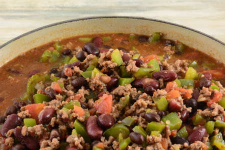 Mexican chili or chilli with meat. Cooked kidney bean, minced meat, chili, corn and pepper in pan on wood table