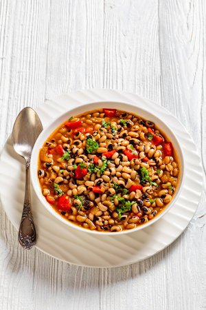 Vegan Hoppin John, savory and spicy black-eyed pea stew in black bowl on dark wood table, southern America recipe, vertical view from above