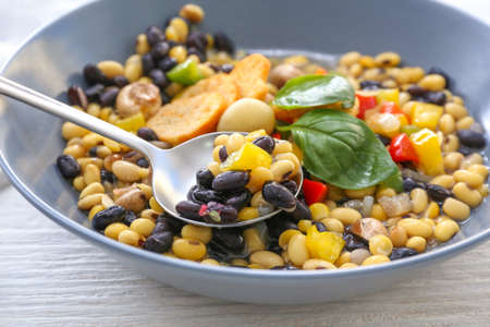 Healthy vegetarian three beans soup with vegetables in a bowl close-up on the table.