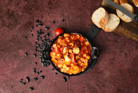 Bean stew with black pudding, peppers and potatoes. Top view table with decoration.
