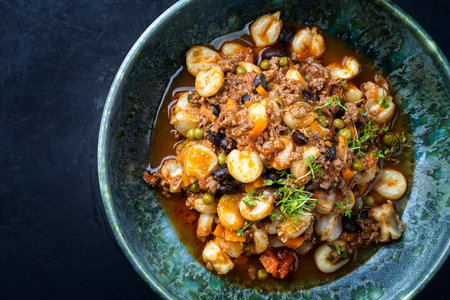 Top view of spicy dish with beans in tomato sauce with fresh basil on grey concrete background
