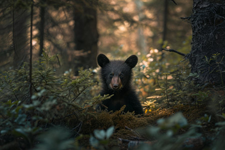 This captivating close-up image showcases a charming black bear cub, Ursus americanus, in its natural environment. The cub's alert posture, with its ears perked forward, suggests curiosity and a playful spirit. Its soft, dark fur contrasts beautifully with the surrounding foliage, creating a striking visual narrative. The image's focus on the cub's expressions and body language draws the viewer into a moment of close observation of this remarkable creature. This wildlife photography captures a fleeting moment in the life of a young bear, showcasing its inherent vitality and the beauty of the natural world. The detail in the image allows for appreciation of the intricate textures and patterns in the bear's fur, and the surrounding elements. The image evokes a sense of wonder and provides a glimpse into the fascinating world of black bears. This stunning nature stock photo is perfect for various uses, from conservation awareness posters and educational materials to inspiring nature-themed artwork and displays. It's an excellent choice for projects focusing on wildlife, nature, conservation, or environmental education. The image's composition and lighting effectively highlight the cub's features and the ambience of its natural habitat, offering a powerful visual narrative to engage viewers. Ideal for organizations dedicated to wildlife protection and promotion of environmental consciousness, this image is a valuable asset for any project seeking to raise awareness regarding the importance of preserving natural ecosystems.