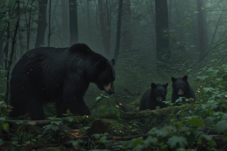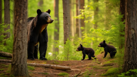 Wild Harmony: Black Bear Family in Morning Forest