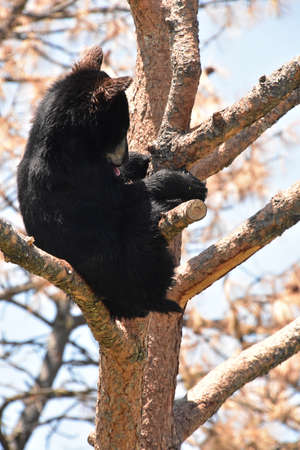 Cute black bear cub sticking his tongue out on a tree branch.