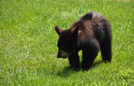 Very cute black bear cub walking and wandering in a grass field.