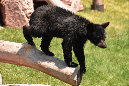 Black bear cub standing at the end of a log.